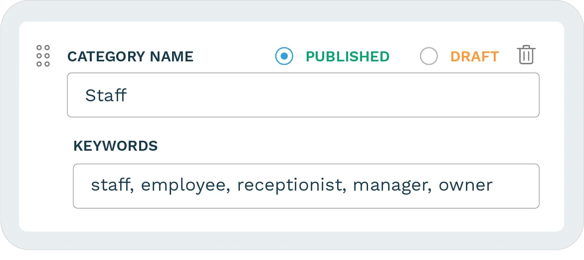 ReputationStacker groups review sentiment into custom categories such as service quality, staff behavior, pricing, or responsiveness. This allows businesses to track how specific aspects of the customer experience are perceived over time.